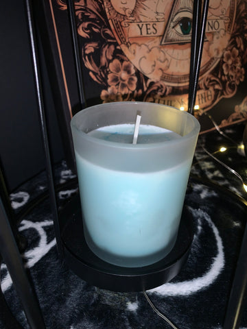 Full Moon Spell- white jar, Color: Sky Blue & Black Pearl, Scent: Black Coral & Moss- Dive into the darkly aquatic, aromatic experience of Black Coral and Moss. This sensual fragrance oil marries notes of lavender, amber, dark musk, and vetiver.