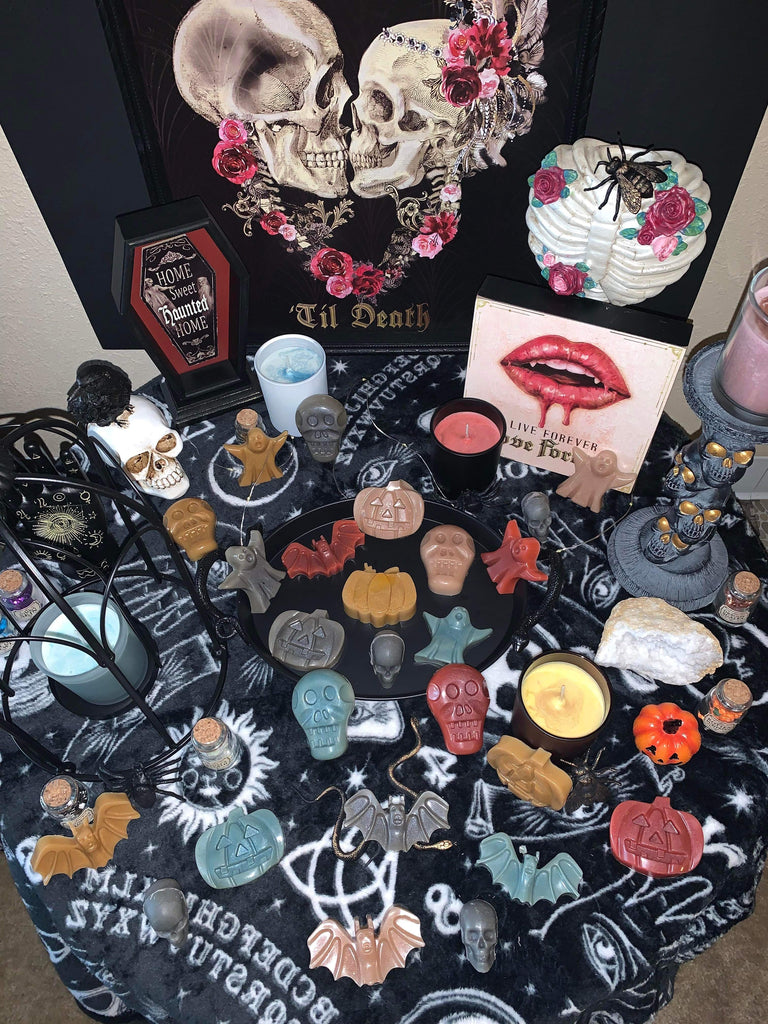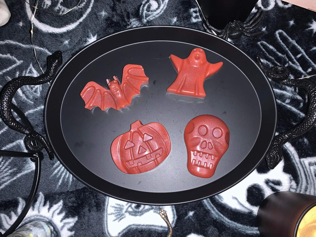 Vampire Love- black jar, Color: Dark scarlet, Scent: Black Cherry Merlot- is a boozy, sophisticated twist to the classic black cherry. Top notes of black currant and apple brighten the red wine and black cherry heart, infused with natural essential oils, including patchouli, nutmeg, and Davina.