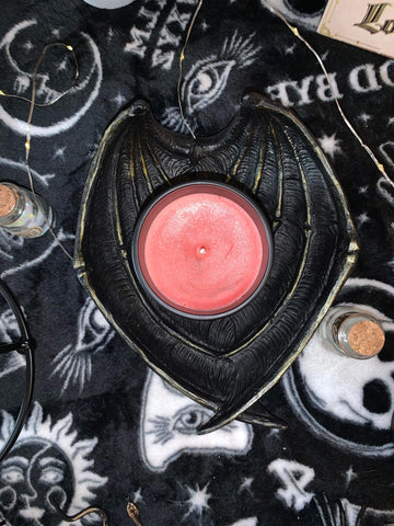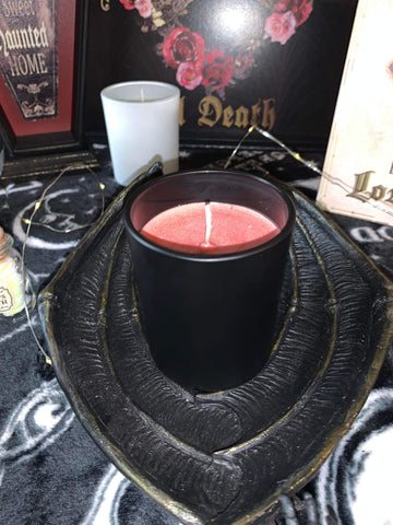 Vampire Love- black jar, Color: Dark scarlet, Scent: Black Cherry Merlot- is a boozy, sophisticated twist to the classic black cherry. Top notes of black currant and apple brighten the red wine and black cherry heart, infused with natural essential oils, including patchouli, nutmeg, and davana.