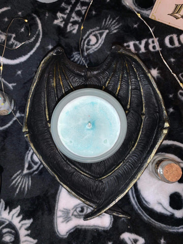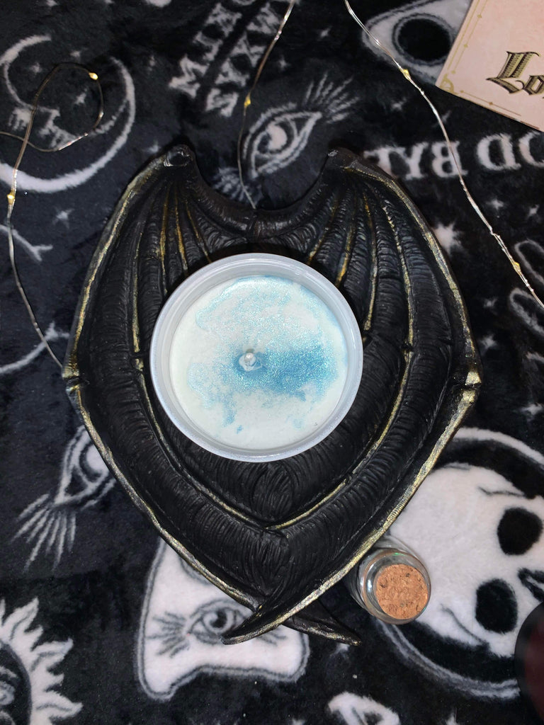 Full Moon Spell- white jar, Color: Sky Blue & Black Pearl, Scent: Black Coral & Moss- Dive into the darkly aquatic, aromatic experience of Black Coral and Moss. This sensual fragrance oil marries notes of lavender, amber, dark musk, and vetiver.