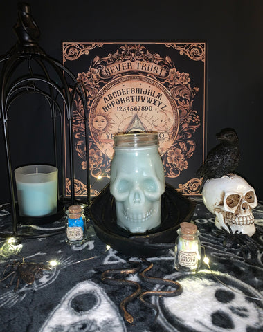 Full Moon Spell- Color: Sky Blue & Black Pearl, Scent: Black Coral & Moss- Dive into the darkly aquatic, aromatic experience of Black Coral and Moss. This sensual fragrance oil marries notes of lavender, amber, dark musk, and vetiver.